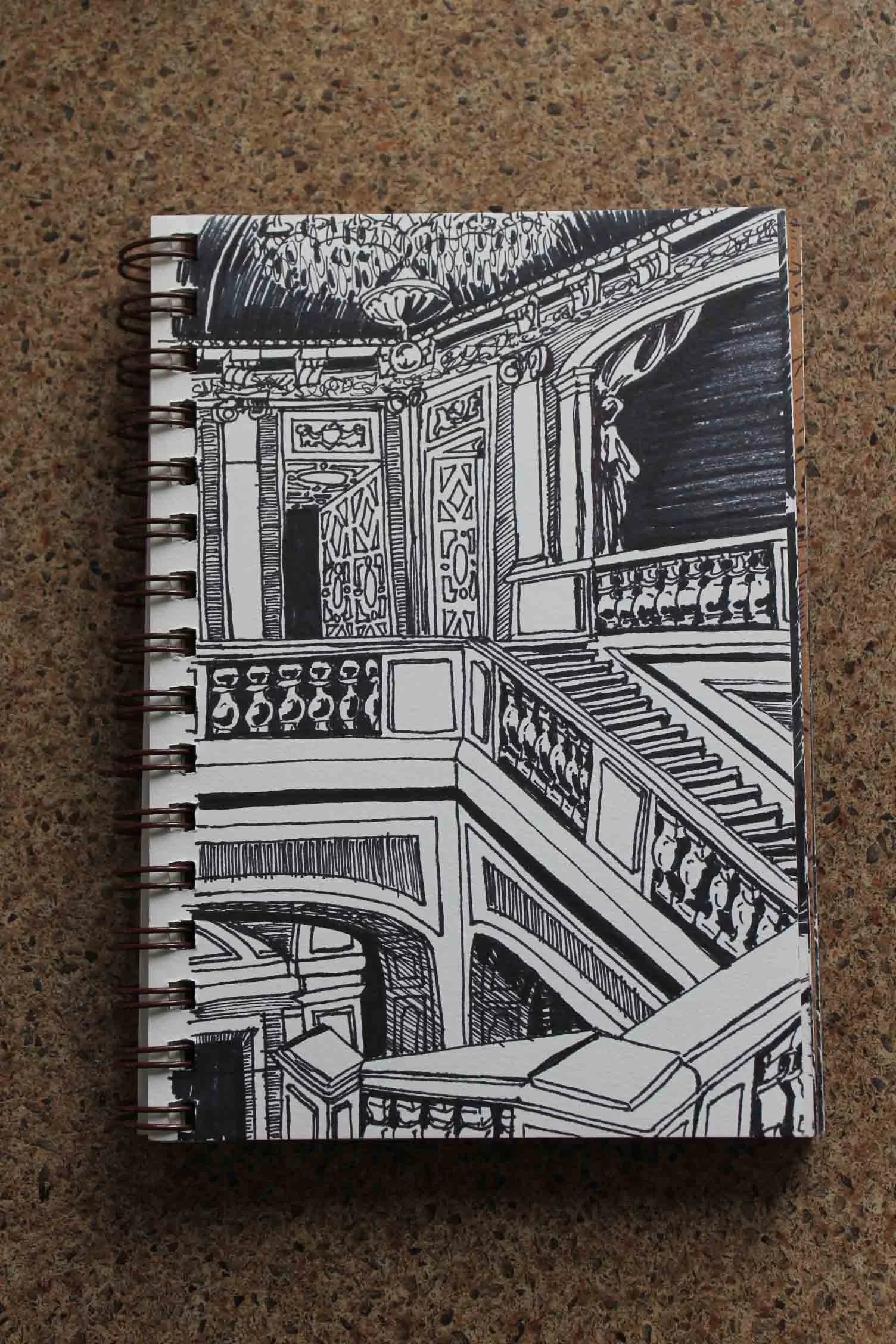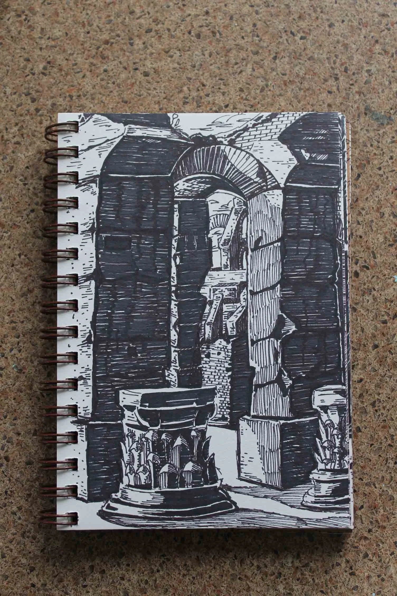 For the most part completed while watching TV, the majority of sketch subjects are from old movie poster and architectural books.